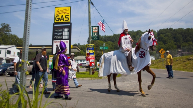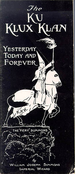 A white man on horseback chasing a black man on foot also suggests the KKK night riders and their reign of terror against freed slaves shortly after the Civil War. The original Klan was headed by Nathan Bedford Forrest, a former Confederate cavalry general—and the image of a Champion of the White Race on horseback would become as central to Klan tradition as the burning of crosses.